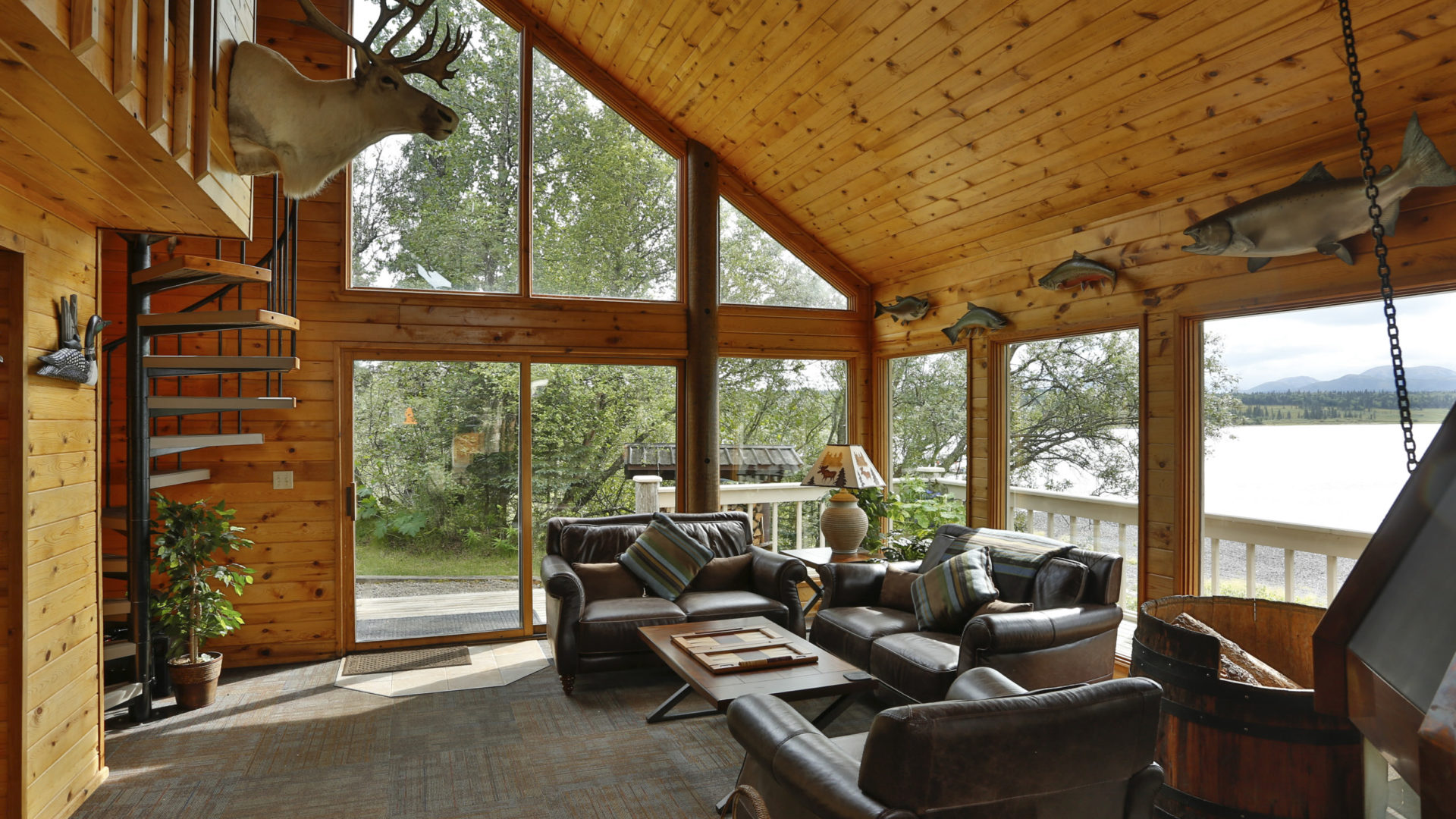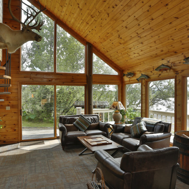 Our beautiful, modern lodge boasts large bay windows framing stunning views of the lake and mountains beyond. This is a rugged immense land of startling beauty – a great place to just step out of everyday pressures and relax.
